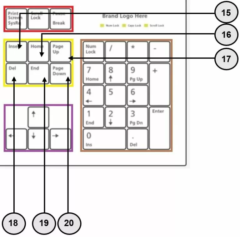 | 16 Pos1 / Home | Position 1 / Home: Diese Taste dient dazu, den Cursor (Schreibmarke bzw. Einfügemarke) zu steuern. In Textverarbeitungsprogrammen wird die Schreibmarke durch das Drücken der Home-Taste zum Zeilenanfang verschoben. (¬ End/Ende) |