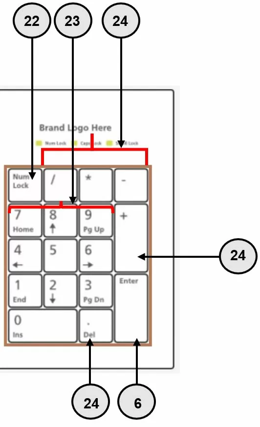 | 22 Num / Num Lock | Num Lock: Sie können mit dieser Taste die Zahlen im Ziffernblock aktivieren (wenn das kleine Num-Lämpchen auf Ihrer Tastatur leuchtet, wissen Sie das der Nummernblock aktiviert ist). Haben Sie die Taste nicht gedrückt, so sind die Sondertasten bzw. Pfeile in diesem Block aktiviert. |