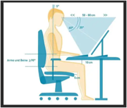 - Rücken: Sitzen Sie aufrecht, mit dem Rücken gerade und an die Rückenlehne des Stuhls gelehnt. Vermeiden Sie es, sich nach vorne zu beugen.